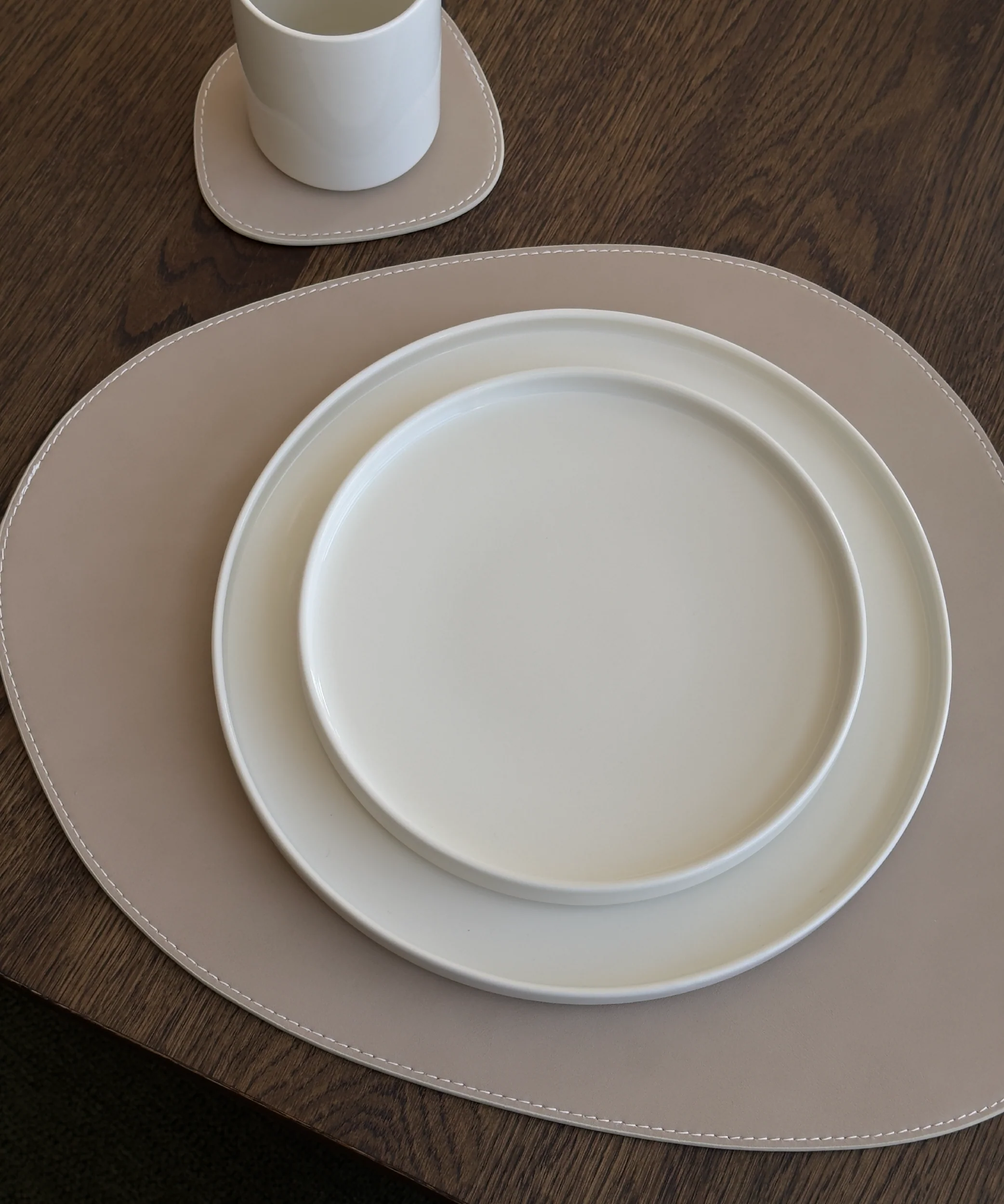 Discover Jade - the asymmetrical, reversible coasters made of faux leather in stylish taupe and cream. Depending on your mood, you can turn the coasters over, choose your color and adjust the orientation of the organic shape. With two practical sizes, the coasters offer enough space for your glass or cup (14.5 cm x 13.5 cm) as well as your stylish dishes (44 cm x 36.5 cm). Jade gives your place setting a modern, elegant touch and brings aesthetics to your table. Perfect for your next dinner or cocktail party, a wine date with friends or your everyday use.